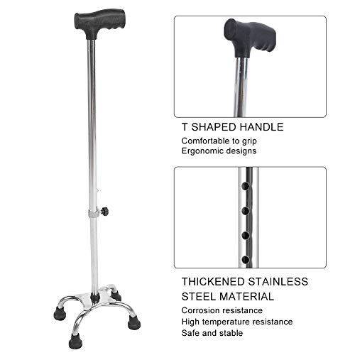 KOMFORTABLER ERGONOMISCHER GRIFF: T-förmiger Griff, ergonomisches Design, angenehm zu greifen. Der komfortable Quad-Cane hat weiche Griffe, die Ihnen auch nach stundenlangem Gebrauch einen angenehmen und belastungsfreien Griff bieten.. KORROSIONSBESTÄNDIGER LEICHTER RAHMEN: Verdicktes Edelstahlmaterial, Korrosionsbeständigkeit und Hochtemperaturbeständigkeit, sicher und stabil. Durch zwei Sicherheitsfunktionen kann sichergestellt werden, dass der Stock auf der eingestellten Höhe bleibt, ohne zu verrutschen.. EINSTELLBARER QUAD CANE: 9 Zahnradhöhen sind einstellbare, humanisierte Designs, die für Menschen unterschiedlicher Größe geeignet sind, ein unangenehmes Biegen verhindern und bequem zu Ihrer Körpergröße passen, da sie bequem und einfach von 29 bis 38 Zoll eingestellt werden können.. ÜBERLEGENE STABILITÄT UND TRAKTION: Vierbeinige Stützbasis, superstarke Lagerkraft, fester und zuverlässiger, stabiler und langlebiger Quad-Stock bieten optimalen Halt, Stabilität und Gleichgewicht für einen Gehstock.. LANGLEBIGER QUAD CANE: Gummibeinabdeckung, hält den Stock stabil auf dem Boden, ordentlich und langlebig, mit haltbaren, rutschfesten Gummispitzen bietet optimale Traktion und Manövrierfähigkeit für einen festeren Stand, was nicht nur Ihre Mobilität, sondern auch Ihr Selbstvertrauen verbessert.
