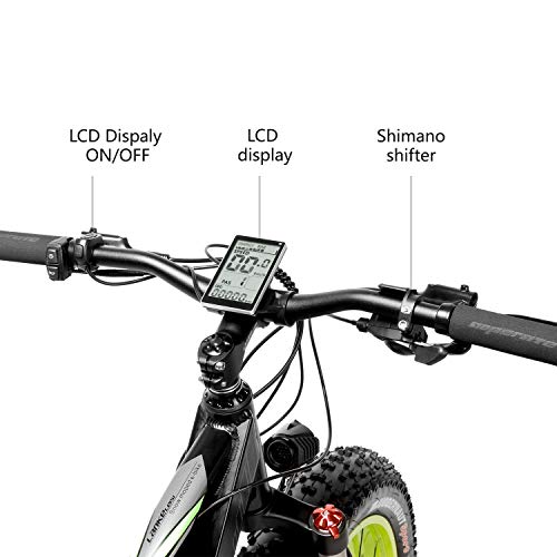 Hochgeschwindigkeitsmotor: Es handelt sich um einen bürstenlosen Hochleistungsmotor mit 500 W, einen Hochleistungs-Akku mit 36 V/18 Ah, eine hohe Leistung und eine lange Lebensdauer im Radfahren. PAS-Modus: Abstand bis zu 55-75 Meilen.. SHIMANO Brems- und Schaltgetriebe: Das Shimano M370 9-Gang Getriebe System ermöglicht es Ihnen, die Geschwindigkeit zu wählen, die Ihnen passt. Die perfekten SHIMANO Scheibenbremsen schützen Ihre Sicherheit. Sie sind mit hochwertigen Reifen und stoßabsorbierenden Frontgabeln ausgestattet, die einen hochwertigen Dämpfungseffekt bieten und sehr stabil sind. Effiziente Bremsen und kraftvolle Bremse sind möglich.. E-Bike Fat Tire von hoher Qualität: Das E-Bike hat ein Doppelfederungssystem aus 100 % Aluminiumrahmen, das die Kontrolle der Erhöhungen optimiert. Passen Sie einfach den Sattel und den Lenker des Fahrrads an, um die ideale Position für ein komfortables Fahren zu finden. Verstellbar für Erwachsene und Jugendliche.. 2 Betriebsmodi: Fahrrad, Fahrrad-Modus. Hilfe-Bike: Nehmen Sie ein hochwertiges Unterstützungssystem 1: 1 (PAS-Technologie), eine neue Art von Interaktions-Technologie für Männer und Maschinen, die das Fahren erleichtert. Kombinieren Sie die 2 Modi und wählen Sie nach Ihren Bedürfnissen und genießen Sie das Radfahren.. Garantie: 90 % vormontiert. Das E-Bike und die Batterie sind 1 Jahr Garantie.