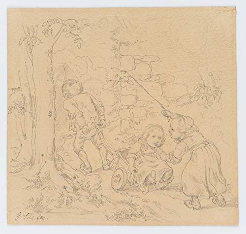 H. W. Fichter Kunsthandel: Gustav SÜS (1823-1881), Spielende Kinder mit Holzkarre, Bleistiftzeichnung