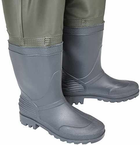 > Wathose aus PVC. Stiefel und Hose aus HQ PVC. 100 % wasserdicht, verschweißt, ohne Nähte.. > Einlegesohlen mit tiefen Stollen (10 und 5 mm), optimale Haftung. Weich. Bequem.. > Elastische Hosenträger, Schnellverschlüsse, Gürtel, Innentasche, Gummi unter den Achseln.. > Ideal für mäßig warmes Wasser (15-20 °C). Zur Verwendung mit einer Hose. Nicht geeignet für schwieriges Gelände, viele Zweige, ...