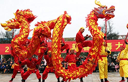 Drachen-Tanzkostüm für 9 Personen. Gesamtlänge: 17 m.. Gesamtgewicht ca. 29 kg. Bestehend aus Kopf, einziehbarem Körper der Stöcke für die Handhabung und 9 Kostümen.