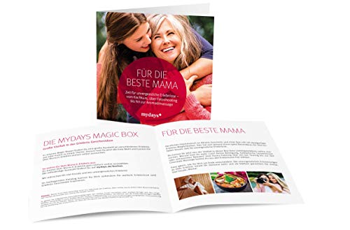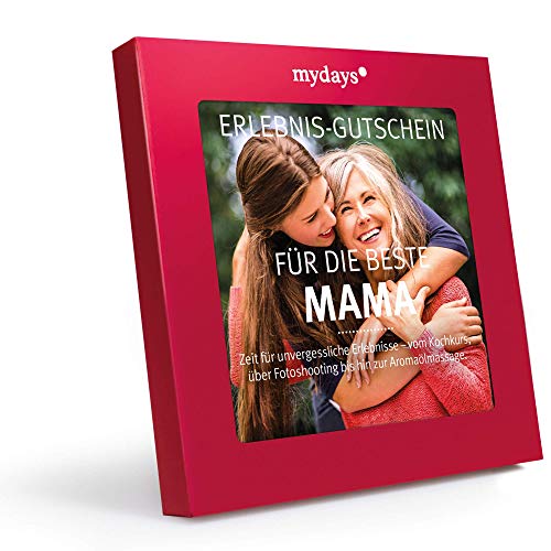 ? PERSÖNLICHES GESCHENK ZUM MUTTERTAG: Ein Gutschein für 1 Person zum Wohlfühlen und Genießen. Ein Geschenk für Mama, das maßgeschneidert und unvergesslich ist.. ? FREIE AUSWAHL: Über 80 Erlebnisse - zum Beispiel Massagen, Candle Light Dinner, Kriminal Dinner und Städtetrips! An über 700 Erlebnisorten, zum Beispiel Berlin, Hamburg, Köln, München und Stuttgart. ? GESCHENKBOX: In hochwertiger, roter Geschenkbox mit Broschüre zum Stöbern und Entdecken. ? SCHENKSICHERHEIT: Der Gutschein ist 3 Jahre lang gültig, frei übertragbar und kann jederzeit umgetauscht werden. ? EINFACH EINLÖSEN: 1. Gutschein-Code auf mydays.de eingeben 2. Erlebnis auswählen 3. Termin vereinbaren. 4. Erlebnis genießen