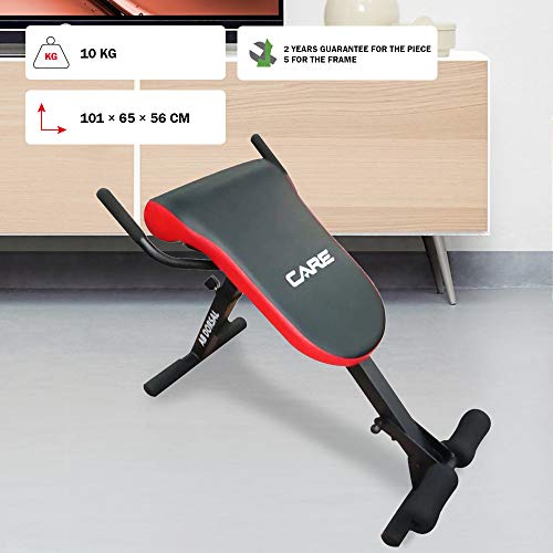 Muscler Deinen Bauchmuskeltrainer und Deinen DOMICILE Rückenmuskel: Mit dem AB DORSAL Hantelbrett von Care Fitness trainieren Sie Ihre Bauchmuskeln und Rückenmuskeln effizient ohne den Komfort Ihrer Wohnung zu verlassen. Praktisch, komfortabel und strapazierfähig, diese Trainingsbank mit vielen Neigungen hilft Ihnen, Tag für Tag zu halten und die Figur Ihrer Träume zu formen.. Eine stabile Struktur für Ihre Experten: Mit ihrer starren Struktur sorgt die Hantelbank AB Dorsal von Care Fitness für sichere Sportsitzungen. Die Bank ist geeignet für Benutzer mit einem maximalen Gewicht von 110 kg.. Ein Gewinn an Platz: Die Trainingsbank AB Dorsal wurde entwickelt, um das tägliche Leben der Benutzer zu erleichtern. Nach dem Training nimmt AB Dorsal nur sehr wenig Platz ein und ist dank seiner sehr großen Maße und seines geringen Gewichts leicht zu verstauen. Maße: L 101 x B 65 x H 56 cm Gewicht: 10 kg. Material garantiert: Bank 5 Jahre auf dem Gestell und 2 Jahre Verschleißteile.. REGULIERTE UND EINFACHE ANWENDUNG: Die Hantelbank eignet sich besonders für den gelegentlichen oder regelmäßigen Gebrauch, bis zu 3 Stunden pro Woche. Es ist ideal für Fitness-Studios zu Hause. Für Ihre Sicherheit entspricht es der CE-Norm – ISO20957.