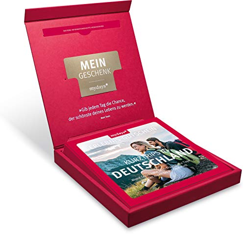 KURZURLAUB FÜR 2 PERSONEN: Erkundet die schönsten Orte der Republik und freut Euch auf einen unvergesslichen Kurztrip mit Eurem Lieblingsmenschen!. REISEN IN DEUTSCHLAND: Ob Städtetrip in Dresden oder Aktivurlaub an der Ostsee – verschenke einen dreitägigen Kurztrip für 2 in ein Traumhotel nach Wahl! Inklusive Frühstück!. GUTSCHEIN IN GESCHENKBOX: Hochwertige, rote Box mit Broschüre zum Stöbern und Entdecken. GUTSCHEIN VERSCHENKEN: Der Gutschein in der Urlaubsbox ist 3 Jahre lang gültig, frei übertragbar und kann jederzeit umgetauscht werden. EINFACH EINLÖSEN: 1. Urlaubsbox Kurzurlaub öffnen 2. Gutschein-Code auf mydays.de eingeben 3. Hotel auswählen und Termin vereinbaren. 4. Urlaub für 2 genießen