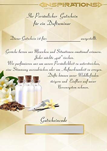 Buchbar an vielen Veranstaltungsorten in Deutschland. Sie erhalten einen individuellen Geschenkgutschein direkt per E-Mail. Der Gutschein beinhaltet die Seminarteilnahme für 1Person. Sie erhalten Ihr individuelles Parfum im Flakon zur Mitnahme. Sie erhalten ein Rezept mit Ihrer eigenen Duftölmischung, zur Herstellung von Parfums, Diffuser, Raumsprays, sowie Duftkerzen, mit Ihrem persönlichem Duft