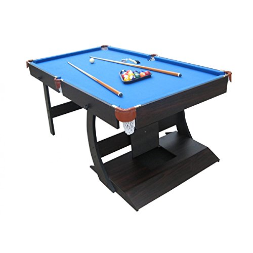 Klappbarer Poolbillardtisch (vertikal faltbar).. Leicht zu verstauen und einfacher Aufbau, garantierte Platzeinsparung.. Hohe Benutzerfreundlichkeit, ideal für Ihr Wohnzimmer oder Spielzimmer.. Dunkelbrauner Tisch mit blauem Tuch.. Im Lieferumfang enthaltenes Zubehör: 2 Queues, 1 Satz Poolbillardkugeln, 1 Bürste, 1 Dreieck und 2 x Kreide.