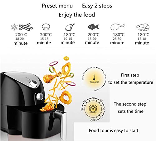 Pommes frites Essen enthält 85% weniger Fett als herkömmliche Pommes Frites ohne den leckeren Geschmack und die knackige Textur zu verlieren. Dazu gehören Hähnchen, Pommes, Fisch, Fleisch und Garnelen.. Die perfekte Art zu kochen: Die in einer Fritteuse gegarten Lebensmittel verlieren nicht ihren Geschmack und ihre leckere Textur. Sie können einfach alle Ihre Lieblings-Lebensmittel zubereiten, indem Sie den voreingestellten Kochmodus wählen.. Mit dieser Luftfritteuse können Sie Ihre Lieblings-Lebensmittel mit wenig oder ohne Öl zubereiten. Dank der Schnellluft-Technologie können frittierte Speisen ohne Öl zubereitet werden. Diese Technologie verwendet warme Luft mit innerer Zirkulation, um Ihre Lieblingsfrittiermittel gesünder zu machen.. Fortschrittliche Sicherheitsfunktionen: Luftschlauch mit integriertem Überhitzungsschutz und Abschaltautomatik, damit Sie sicher sind.. Leicht zu reinigen: Der voll abnehmbare Topf in Familiengröße ist leicht zu reinigen und spülmaschinenfest. Die Antihaftbeschichtung erleichtert und beschleunigt die Reinigung.