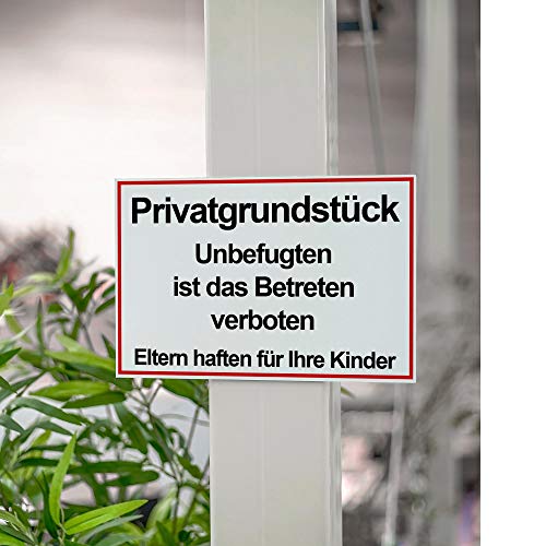 ?? SCHUTZFUNKTION: Mit diesem Schild verweisen Sie darauf, dass sich fremde Personen auf Ihrem Privatgrundstück befinden. Damit schützen Sie sich, Ihre Familie und Ihr Eigentum vor unbefugtem Betreten.. ?? GUT SICHTBAR: Das Blechschild ist mit der roten Umrandung und der schwarzen Schrift auf weißem Untergrund sehr gut lesbar. Es ist von Weitem sichtbar und natürlich für den Außenbereich geeignet.. ?? LEICHT ANZUBRINGEN: Das Schild wird ohne Bohrungen geliefert. So können Sie es flexibel dort anbringen wo Sie es brauchen. Die Löcher können mit einem Standardbohrer ganz leicht gebohrt werden.. ?? AUFGEDRUCKT: Schilder aus der GESCHENKE-FABRIK können mit beliebigen Hinweisen beschriftet werden. Die Schrift ist nicht geprägt, sondern auf einer stabilen Dibond Platte aufgedruckt.. ?? DEUTSCHE QUALITÄT: Alle Produkte der GESCHENKE-FABRIK werden in Deutschland hergestellt. So können wir Ihnen eine hochwertige Qualität garantieren. Kontaktieren Sie uns gerne bei jeglichen Fragen.