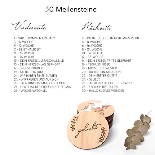 ? LIEBE IM BAUCH - Ihr bekommt ein Baby? Euch steht eine spannende und unvergessliche Zeit bis zur Geburt eures kleinen Wunders bevor. Verkündet die Schwangerschaft mit tollen Fotos und genießt jeden Moment.. ? WERTVOLLE MOMENTE FESTHALTEN - Erlebe und teile die schönsten Momente deiner Schwangerschaft und die Entwicklung deines Babybauchs mit deinen Liebsten, auf ganz originelle Weise.. ? VERSCHENKE MOMENTE - In einem wunderschön bedruckten Stoffbeutel verpackt sind die Holzscheiben eine ganz besondere Geschenkidee zur Schwangerschaft, Geschenk für werdende Mamas, werdende Eltern.. ? LIEBEVOLL SELBST GESTALTETES SET - Das Set besteht aus 30 verschiedenen Wochen-/Monatskarten und Ereignissen, dabei sind 15 wunderschöne Holzscheiben beidseitig lasergraviert worden.. ? QUALITATIV HOCHWERTIGES SET - Uns liegt deine Zufriedenheit sehr am Herzen. Wir von Mikito lieben dieses Meilensteinkarten Set und vertrauen auf unsere Qualität, deshalb erhältst du von uns eine 30-tägigen Geldzurück-Garantie.