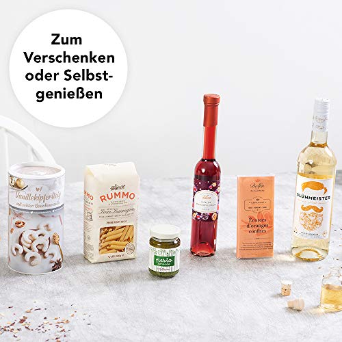 Suchst du noch ein außergewöhnlich leckeres Geschenk oder möchtest einfach Deine Liebsten an den Festtagen verwöhnen? Dann hol‘ dir den Präsentkorb mit 6 köstlichen Produkten aus kleinen Manufakturen inkl. Geschenkkarton nach Hause!. Ein liebevoll zusammengestellter Mix aus italienischen und traditionellen Weihnachtsmarkt-Klassikern. Genieße eine leckere Pasta von Rummo mit einem unwiderstehlich leckerem Pesto Genoveser Art.. Als Aperitif oder Absacker dient der winterliche Winterpflümli Likör aus der Eifel von Feinkost Laux. Wärme dich auf mit weißen Bio-Glühwein aus dem Hause Glühmeister.. Kleine Nachspeise gefällig? Mit der Backmischung aus der Stöber Mühle gelingen Dir leckere Vanillekipferl im Nu. Wer es schokoladiger mag, darf sich über die Zartbitterschokolade von Dolfin freuen.. Die Winterbox für's Herz kommt inklusive Geschenkkarton. Mach Dir ein genussvolles Fest oder verschenke die Box als Geschenkkorb zum Verwöhnen. Hinweis: Dieses Set enthält alkoholische Getränke!