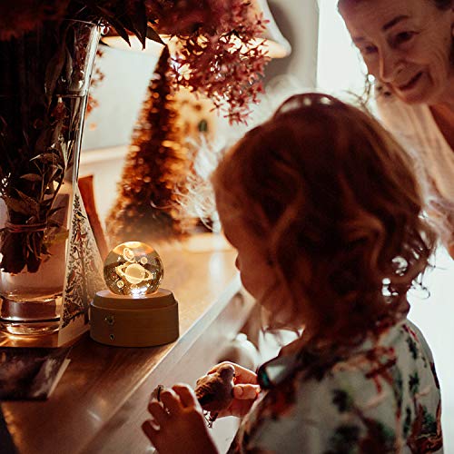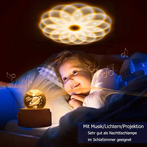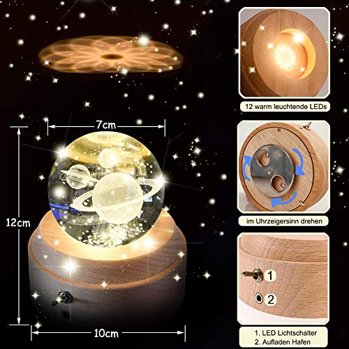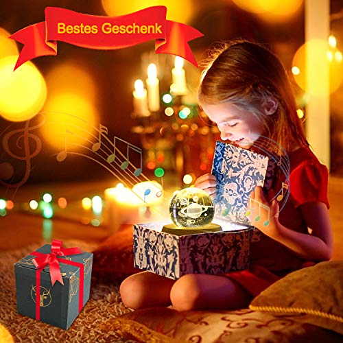 ???? [So funktioniert die Spieluhr mit beleuchteter Kristallkugel] - Einfach die Metallscheibe am Boden im Uhrzeigersinn drehen (2 bis 3 Umdrehungen) – die Spieluhr erklingt, das Gehäuse dreht sich dazu. Im Gehäuse sind 12 warm leuchtende LEDs eingebaut, die sich mit dem Schalter an der Seite einschalten lassen. Das Licht wird in der Kristallkugel gebrochen, schafft so ständig wechselnde Lichteffekte an der Decke, die von den Klängen der Spieluhr untermalt werden.. ???? [Die Kristallkugel mit 3D-Elementen darin] - In der Kristallkugel (die natürlich nicht aus Kristall, sondern aus einem speziellen Glas besteht) schweben“ mehrere Planeten, " die von einem ganz speziellen Laser mitten in die Kugel graviert wurden. Wenn sich die Kugel dreht, können Sie die kleinen Planeten aus allen Richtungen betrachten, also quasi dreidimensional. Übrigens können Sie die Kristallkugel auch einfach vom Holzgehäuse abnehmen, zum Beispiel als hübsche Deko ins Regal stellen.. ???? [Spieluhr und Beleuchtung] - Die Spieluhr ist mit einer hochwertigen Mechanik aus Japan ausgestattet, wie fein klingt und lange hält. 2 bis 3 Umdrehungen der Metallscheibe am Boden reichen für etwa eine Minute Musik. Die Kugel wird von modernen LEDs beleuchtet, die von einem Akku gespeist werden, kaum Energie verbrauchen und lange halten. Die LEDs leuchten 8 bis 12 Stunden lang mit einer Akkuladung, das Laden dauert etwa 2 bis 3 Stunden.. ???? [Gehäuse aus Naturholz] - Unser Holzgehäuse besteht aus erstklassigem deutschem Buchenholz, das von Hand poliert wird und ohne aggressive Farben auskommt. Es sieht hübsch aus, fühlt sich gut an und riecht nicht unangenehm.. ???? [Ein tolles Geschenk] -Die Lichteffekte sind sanft, blenden nicht und stören nicht beim Schlafen. Übrigens können Sie die Spieluhr auch einfach als Nachttisch- oder Entspannungslampe ohne Musik verwenden. Genau das Richtige für Freunde, frischgebackene Eltern, Kinder – zu Weihnachten, zum Geburtstag, am Valentinstag, Muttertag oder einfach so.