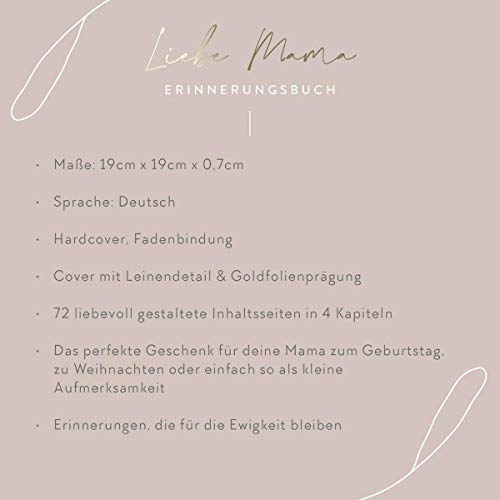 Deine Mama begleitet Dich seit Deiner Geburt, und es gibt wahrscheinlich keinen Menschen, mit dem Du mehr erlebt hast - halte Eure Erinnerungen und Erlebnisse in diesem wunderschönen Ausfüllbuch fest. Das Erinnerungsbuch "Liebe Mama" ist das perfekte Geschenk, um Deiner Mama zu zeigen, wie lieb Du sie hast - egal ob zum Geburtstag, Muttertag oder einfach zwischendurch - sie wird sich riesig freuen. Das Buch enthält Ausfüllseiten über Deine Geburt, über Deine Kindheit bis hin zu Euren schönsten Urlauben, Fotos und gemeinsamen Erinnerungen. Produktdetails: Hardcover 19 x 19 cm aus Kraftkarton mit Goldfolienprägung und schwarz bedruckt 60 Seiten. Wenn Du stilvoll gestaltete Produkte mit Liebe zum Detail suchst, bist Du bei uns von JO & JUDY genau richtig. Wir bieten Produkte im Bereich Schreibwaren, Fashion und Home in modernem Design