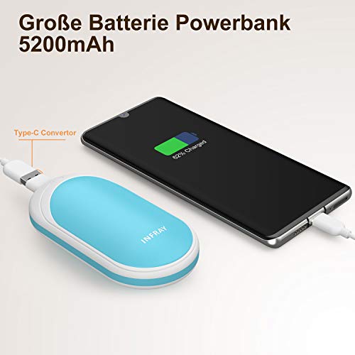 ?Handwärmer?3 einstellbare Heizmodi. Beide Seiten schnell in 3 Sekunde aufwärmen. 3 Stufen von einstellbarer Temperatur von 95-107 ° F / 118-131 ° F, drücken Sie den Schalter und geben Sie sofort die Wärme an Sie.. ?Powerbank?5200 mAh Lithiumbatterie mit Typ-C-Ladeanschluss kann eine volle Ladung für iPhone, Samsung Galaxy, HUWWEI and other Android phone. Anzeigelampen informieren Sie über die verbleibende Batterie.. ?VERBESSERTE SICHERHEIT?Die verbesserte Schaltung eliminiert vollständig alle Arten von schlechten Kontakten, um die Lebensdauer unseres Handwärmers zu gewährleisten und schützt vor Überladung, Überhitzung und Kurzschluss.. ?Beste Geschenk?Es kann als Handwärmer, auch als Powerbank verwendet werden. Dieses Gerät hält Ihre Hände an eisigen Tagen warm. Es ist wunderschön gemacht und kommt mit einer schönen Box, perfektes Geschenk für Familie und Freunde im Winter.. ?Was Sie erhalten?1*5200mAh Handwärmer, 1*USB Kable, 1* Benutzerhandbuch, 60 Tage Geldrückgarantie und 1 Jahr Wenn Sie jede Frage haben, kontaktieren Sie mit uns, und wir werden innerhalb von 12 Stunden antworten.
