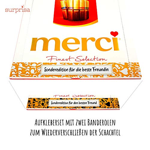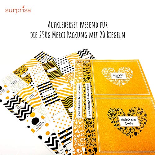 GRENZENLOSE MÖGLICHKEITEN: Ihrer Phantasie sind keine Grenzen gesetzt. Sagen Sie was Sie schon immer sagen wollten und gestalten Sie einfach kreativ und liebevoll ihre ganz persönlichen Sticker.. PERSÖNLICH: Drücken Sie den süßen Schokoladentäfelchen Ihren ganz persönlichen Stempel auf. Einfach Schokolade verschenken kann jeder - machen Sie die besonderen Geschenke.. PASSEND FÜR JEDEN ANLASS: Egal ob als Geschenk zum Geburtstag, zu Weihnachten oder einfach nur für Zwischendurch – ein persönliches Geschenk erwärmt immer die Herzen.. LIEBEVOLL GESTALTET: Unsere Danksagungssticker sind mit viel Liebe entwickelt und hochwertig verarbeitet. Sie sind selbstklebend, und jeder Packung liegen Blankosticker zum selber Gestalten bei.. BESONDERE GESCHENKIDEE: Nie mehr langweilige Karten! Mit SURPRISA können Sie jetzt besonders kreativ Danke sagen und das mit einem persönlichen Geschenk, das von Herzen kommt!