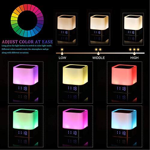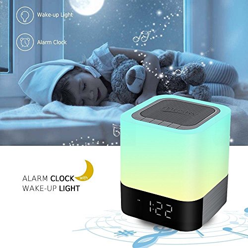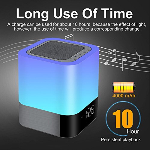 ?5 in 1 super Multifunktionen?Touch Sensor Nachtlicht + Bluetooth 4,0 Hifi Lautsprecher + Digital Wecker + MP3 Player + Hands Free Call, einfache Verbindung mit den meisten Bluetooth-fähigen Geräten, 33Ft / 10M Bluetooth-Reichweite. Mit Hilfe von High-Power-Woofer und einzigartiger Basstechnologie, Sie können den Super Quality Sound genießen, nachts Hörbücher im Schlafzimmer hören oder Musik beim Kochen oder Sport spielen.. ?Romantische und bunte Nachtlichter?48 Farben, Das Licht ändert seine Farbe mit der unterschiedlichen Lautstärke und dem Rhythmus. 3 Level-Helligkeit einstellbar mit dem kühlen Touch-Sensor-Design, es kann für Sie warmes geführtes Nachtlicht komfortable Umgebung schaffen. Portable Smart LED-Licht kann für Entspannung, Reisen, Wohnzimmer, Schlafzimmer lesen.. ?Die Wiederaufladbare Batterie von Grosse Kapazität?4000mAh Große Kapazität Batterie, lange Spielzeit und lange Belichtungszeit. Einfaches Ladung per USB-Kabel mit 6-10 Stunden Ladezeit.. ?Wundervolle Klangqualität?Bluetooth-Lautsprecher mit Hochleistungs-Woofer, einzigartige Bass-Technologie, Egal Bluetooth-Verbindung, MP3 Spieler, oder AUX-Verbindung, genießen Sie den Klang in Superqualität, Es kann zum Entspannen, Reisen, Lesen im Schlafzimmer und Kinder Nachtlicht verwendet werden.. ?Das beste Geschenk für Jede Menge?Multifunktionales kreatives und modernes Design machen es zum besten Geschenk für jeden Anlass, zum Beispiel für Yoga-Musik-Spieler, in Freunden Party, Weihnachten, Ostern, Erntedankfest, Geburtstag, Jahrestag, Muttertag, Vatertag, Halloween, Hochzeit, usw. Unser Grundsatz ist, den Kunden das Beste zu geben, damit ich jedem Produkt eine gute Qualität zusichern kann.