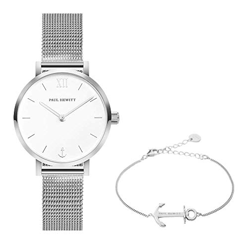 SCHÖNE GESCHENKBOX: Zwei Accessoires sind in diesem Geschenkset für Damen enthalten: Die Armbanduhr Modest White Sand und die Armkette Anchor Spirit Silber. Sie passen perfekt zusammen.. HÜBSCHE ARMBANDUHR: Hochwertiger Edelstahl ist das Basismaterial für die schöne Modest Damenuhr in diesem Geschenkset. Das Armband ist ebenfalls aus hochwertigem Edelstahl gefertigt.. CLEVER KOMBINIEREN: Du kannst dieses Armkettchen in Silber auch hervorragend mit anderen Accessoires kombinieren. Wenn du z.B. andere Armba?nder mit maritimen oder sommerlichen Motiven hast, passen diese perfekt.. TOLLES GESCHENK: Die richtigen Geschenke für Frauen zu finden, ist manchmal gar nicht so einfach. Mit dem PAUL HEWITT Perfect Match Geschenkset triffst du aber auf jeden Fall eine richtige Wahl (z.B. als Geburtstagsgeschenk).. 24 MONATE GARANTIE: Wir sind von der hervorragenden Qualität unserer Accessoires überzeugt und geben dir daher eine Garantie von 24 Monaten auf unser gesamtes Sortiment.