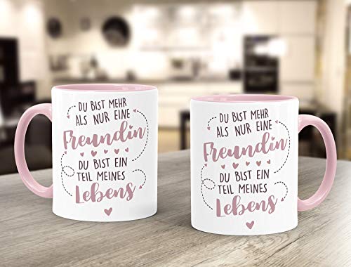 Zeige deiner besten Freundin einfach mal wie wichtig sie für dich ist und schenke ihr zu Weihnachten, zum Geburtstag oder einfach so als kleine Aufmerksamkeit diese zauberhafte-auf Wunsch auch personalisierbar mit Namen-Tasse mit Freundschafts-Spruch. Individualisierte Geschenke sind etwas ganz Besonderes! Diese personalisierte Tasse gehört mit ihrer Individualisierung definitiv in die Kategorie "persönliche Geschenke". Denn was kann persönlicher, was individueller sein, als der eigene Name, das eigene Bild oder die eigenen Worte?!. Einfach online Tasse selbst gestalten, mit Namen, Foto oder Text anpassen, günstig online bestellen und Tasse bedrucken lassen - weil ein Geschenk personalisiert einfach viel persönlicher ist!. Qualitäts-Keramik sowie hochwertige Herstellungsprozesse versprechen eine hohe Langlebigkeit und eine langanhaltende Farbbrillanz der Drucke. Spülmaschinengeeignet für eine leichte Reinigung. Klassische und zeitlose Form mit großem Henkel für einen einfachen und festen Griff.. Unsere personalisierten Tassen werden in Deutschland mit Liebe zum Detail designed und in unserer kleinen Manufaktur sozial, fair und in liebevoller Handarbeit bedruckt. So entstehen ausgefallene, individuelle Geschenke und einzigartige Unikate!