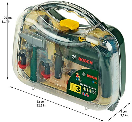 Der robuste Koffer enthält hochwertige und griffige Werkzeuge, die optimal an Kinderhände angepasst sind. Mit Hammer, Säge, Schraubenschlüssel werden die mitgelieferten Schrauben, Nägel und Latten verarbeitet. Das Highlight des Werkzeug-Sets ist die Bohrmaschine mit rotierendem Bohrer, realistischen Geräuschen und künstlichem Funkenschlag (Licht). Mit dem Werkzeugset schulen die kleinen Handerwerker/-innen ihre Motorik, Kreatvität und Fantasie und lernen sicher mit Werkzeug umzugehen. Maße: 32 cm x 8 cm x 29 cm I Geeignet für Kinder ab drei Jahren I Benötigte Batterien: 2 x R6-AA - Nicht im Liegerumfang enthalten
