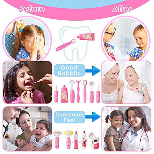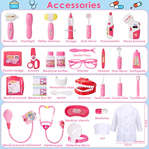 ?Arztkoffer Kinder?: Größe: 21 * 13.5 * 14.5 cm. Kleine Teile! Tolles Spielzeug für Kinder ab 3 Jahre. Bitte unter direkter Aufsicht eines Erwachsenen.. ?35 Stück?: 1 Arztkittel, 1 Hut, 1 Stethoskop, 1 Tropfen Medikamente, 1 Taschenlampe, 1 Blutdruckmessgerät (5 Zubehörteile mit Lichtern) 2 Mundoskopie, 1 Pinzette, 1 kleiner Hammer, 1 Tablett, 1 Glas, 2 Medizinflasche , 1 Schere, 1 Spritze, 1 Skalpell, 1 Blutdruckdichtung, 1 Zahnpasta, 2 Medikamentenboxen, 1 Prothese, 1 Zahnhaken, 1 Schraubenfüller, 2 Löffel, 1 Blutstillungsband, 1 Medikamentenkarte, 1 Zahnseide, 1 Scheinwerfer 1 Tragetasche.. ?Licht und Ton?: Das Stethoskop kann nicht nur leuchten, sondern auch Herzschlaggeräusche erzeugen. Und anderes Zubehör kann auch Lichter machen, die Aufmerksamkeit Ihres Kindes auf das Spielen und Lernen lenken.. ?Rollenspiel Spielzeug?: Ein cooles Rollenspiel für Kinder - genießen Sie es, ein kleiner Arzt oder eine kleine Krankenschwester zu sein, und haben Sie keine Angst, wieder einen Arzt aufzusuchen. Erweitern Sie ihre Fantasie und ihre praktischen Fähigkeiten.. ?Einfach zu Lagern?: Alle in diesem Fall enthaltenen Teile müssen sich keine Sorgen machen, dass Teile verloren gehen oder beschädigt werden. Einfach zu lagern. Ein tolles Geburtstags-, Weihnachts-, Halloween-Geschenk für Ihre Kinder, Jungen und Mädchen.