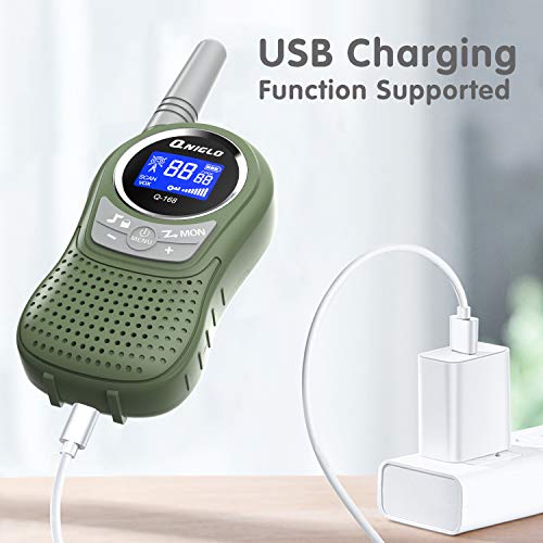 ?PERFEKTES SPIELZEUG FÜR AKTIVITÄTEN IM FREIEN FÜR KINDER? Wenn Sie nach einer Aktivität im Freien suchen, mit der Ihr Kind weniger intelligente Geräte spielen kann, sind Qniglo-Walkie-Talkies für Kinder das beste Geschenk, mit dem Ihr Kind in seiner Kindheit mehr Spaß hat. Kinder konnten drinnen und draußen mit diesen Walky-Talkys spielen. Es fördert die Teamkommunikation zwischen Kindern.. ?Wiederaufladbare Walkie-Talkies? Im Vergleich zu den meisten Walkie-Talkies für Kinder auf dem Markt verwenden unsere Walkie-Talkies zunächst einen wiederaufladbaren 1100-mAh-Akku. So können Sie das Funkgerät direkt über ein USB-Kabel aufladen, ohne die Batterien zu entfernen, anstatt häufig die AAA zu wechseln Batterien. Wenn die Batterie schwach ist, piept es weiter, um Sie zu warnen.. ?Einfach zu bedienen und freihändig VOX? Durch das ergonomische und leichte Design passt das QNIGLO Kinder-Walkie-Talkie gut in die meisten Hände des Kindes. Die Bedientaste ist für das Kind leicht zu finden. Drücken Sie einfach die PTT-Taste, um Mit den Gürtelclips können Ihre Kinder die Walkie-Talkies an den Taschen befestigen. Außerdem bietet die VOX-Funktion eine nahtlose Kommunikation mit Ihren Kindern. Sie müssen während der Beantwortung des Anrufs keine Taste anhalten und drücken.. ?Kristallklare Anrufe? Unsere Kinder-Walkie-Talkies mit klarer Sprach- und Geräuschunterdrückungstechnologie mit einstellbarer Lautstärke blockieren Hintergrundgeräusche effektiv und nehmen Ihre Stimme präzise auf. Die Stimme Ihrer Kinder wird am anderen Ende ohne Störung klar gehört auch in einer lauten Umgebung.. ?Beste Geschenke für Jungen und Mädchen im Alter von 3 bis 12 Jahren? Mit den 8-Kanal-Walkie-Talkies für Kinder kann Ihr Kind den speziellen Kanal für seine Freunde und Familie auswählen. Sie können mit diesen Walkie-Talkies drinnen und draußen spielen. Qniglo Walkie Talkies für Kinder sind großartige Spielzeuge für Ihre Kinder. Dies hält nicht nur Ihre Kinder aktiv, sondern verbessert auch ihre Kommunikationsfähigkeiten.