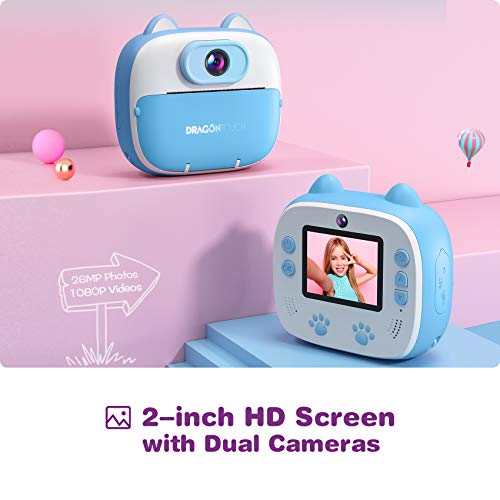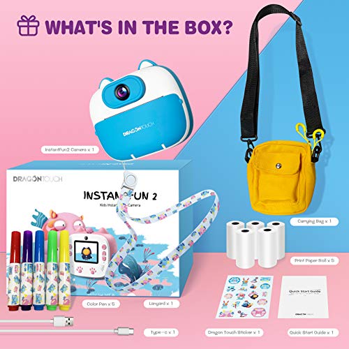 [Duale Kameras vorne und hinten] Mit einem 2-Zoll-HD-Bildschirm und zwei Kameras (vorne und hinten) wird es den Anforderungen Ihres jungen Fotografen besser gerecht. Nehmen Sie alles auf, von Familienbildern bis hin zu bissigen Selfies im Handumdrehen.. [Instant Print & Instant Fun] Kein Warten mehr auf die Entwicklung von Fotos. Die Dragon Touch Instant Print-Kinderkamera ist auf Geschwindigkeit ausgelegt und lässt Kinder die Freude am Fotografieren mit Sofortdruck genießen. Mit der Sofortdruckkamera können Sie auf Knopfdruck Schnappschüsse direkt vom Kameragehäuse aufnehmen und drucken.. [Schwarzweißfotos fördern die Kreativität] Schwarzweißbilder werden auf umweltfreundlichem, sicherem und BPA-freiem Fotopapier gedruckt. Lassen Sie Ihre Kleinen ihre Kreativität zum Leben erwecken, indem Sie die gedruckten Fotos mit den mitgelieferten Cartoon-Aufklebern und Farbstiften dekorieren und ausmalen. Einfach zu bedienen, wirtschaftlich zu besitzen, perfekt für Kinder.. [Weitere lustige Kameraeffekte] Diese Kinderkamera kann professionelle HD 1080P-Videos und 26 MP-Fotos aufnehmen. Es verfügt außerdem über 35 integrierte Fotorahmen (einschließlich 8 exklusiv von Dragon Touch entworfener Bilder), 7 Fotoeffekte und 6 Farbvideomodi. Diese Mini-Videokamera ist perfekt für Ihren kleinen Fotografen geeignet und bietet Ihnen eine Vielzahl von Möglichkeiten.. [Kreative Geschenke für Kinder] Diese süße Druckkamera wird mit einer Silikonschutzhülle geliefert, die tropfenfest und langlebig ist. Die Digitalkamera wird mit 5 Rollen Fotopapier, Cartoon-Aufklebern, Farbstiften, einem USB-Typ-C-Kabel und einer Kurzanleitung geliefert, damit Sie sofort loslegen können. Das Kit enthält außerdem eine Kameratasche und ein Lanyard, die das Tragen erleichtern. Ein ideales Geburtstagsgeschenk oder Weihnachtsgeschenk für Mädchen und Jungen.
