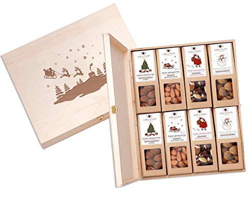 ? WEIHNACHTSEDITION – Verpackt in attraktiven Beuteln mit Sichtfenster und Weihnachtsmotiv werden diese 8 edlen Nuss & Schoko Snacks in einer hochwertigen Birkenholzbox geliefert und sind das perfekte Geschenk zur Advents- und Weihnachtszeit für Freunde, Familie, Firmenkunden und anspruchsvolle Snack-Gourmets.. ? 8 PREMIUM SNACKS – Freuen Sie sich auf 2 x Haselnusskerne in Zimtvollmilch, 2 x Trüffelmandeln mit Kakao, 2 x Edelnüsse & Cranberries, 2 x Cranberries in zartbitterschokolade & Cashewkerne. wellnuss Premium Snacks sind immer ein Garant für leckere und kreative Geschmackskombinationen. Ob privat oder für Firmenkunden, mit wellnuss liegen Sie immer richtig.. ? NATÜRLICHER GENUSS - OHNE ZUSÄTZE – Wellnuss garantiert, dass alle Snacks frei sind von Zusätzen, Konservierungsstoffen, ohne Farbstoffen und ohne künstlichen Aromen. Für einen süßen, sorgenfreien Genuss.. ? EDLE BIRKENHOLZBOX – Verpackt in einer hochwertigen Birkenholzbox sind die wellnuss Snackmischungen das perfekte adventliche Geschenk für anspruchsvolle Snack-Gourmets. Die exquisite Geschenkbox eignet sich hervorragend als Geschenk für Freunde, als Präsent für Kunden oder als Dankeschön für einen besonderen Menschen zu Weihnachten.. ? QUALITÄTSGARANTIE – Wellnuss garantiert hochwertige und exquisite Snack-Kompositionen frei von Konservierungsstoffen, künstliche Aromen, Farbstoffen und Gentechnik. Sämtliche Zutaten unserer Snacks stammen von erfahrenen und IFS-zertifizierten Partnern aus Deutschland, für die umfangreiche Qualitätskontrollen vom Anbau bis zur Auslieferung selbstverständlich sind.
