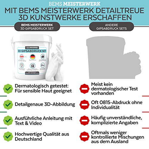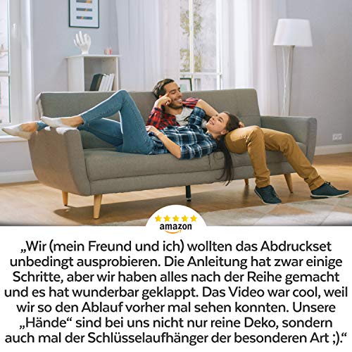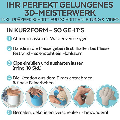 ✅ AUCH FÜR ZARTE (KINDER-)HÄNDE - 3D KREATIONEN VON KLEIN & GROß:Dermatest zeichnet unsere Abformasse als „sehr gut“ aus! Kreieren Sie mit dem Handabdruck Set Erwachsene-, aber auch bezaubernde Kinderhandabdrücke - für einzigartige 3D Andenken, die persönlicher kaum sein können. ✅ FÜR PAARE, GESCHWISTER & CO. - MADE IN GERMANY: Das Handskulpturen Set ist perfekt für zwei gemeinsame 3D Handabdrücke; Überraschen Sie Ihre Liebsten doch mit einem besonderen Geschenk z. B. zu Hochzeiten, Muttertag, Valentinstag. ✅ DIESE HÄNDE PACKEN MIT AN: Der exklusive Eyecatcher! Bemalen Sie Ihren Gips Handabdruck 3D, nutzen Sie ihn als Schmuckständer & Handyhalter oder belassen Sie ihn im natürlichen Gips-Style - lassen Sie Ihrer Kreativität freien Lauf. ✅ DER 3D ABDRUCK ERZÄHLT IHRE STORY - 100% DETAILTREUE: Unsere Hände powern mit uns durch dick & dünn, jede Hautfalte & Pore trägt individuelle Erfahrungen; Erschaffen Sie mit dem Handskulptur Kit eine detailgenaue Abbildung & erfreuen sich an den herzlichen Erinnerungen. ✅ VON ABFORMMASSE & GIPS ZUM GELUNGENEN MEISTERWERK: Wir begleiten Sie mit einem ausführlichen Text & Video Tutorial! Neben dem Handabdruck Set 3D benötigen Sie noch wenige Hilfsmittel (s. unten) & los geht’s