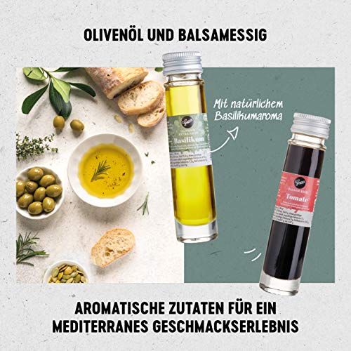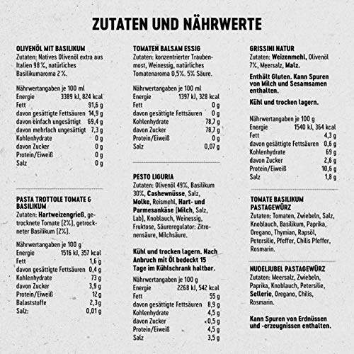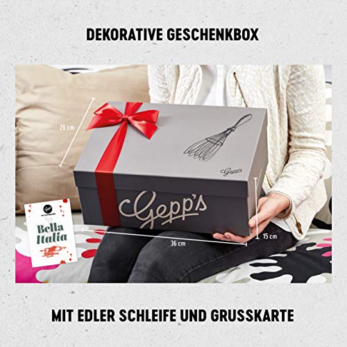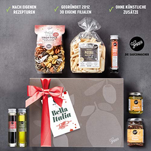 FEINKOST-SPEZIALITÄTEN: Der Präsentkorb ist eine Zusammenstellung der besten italienischen Delikatessen nach den originalen Rezepturen des Familienunternehmens Gepp’s. ***Die Pasta Trottole ist aktuell leider ausverkauft. Stattdessen wird die Pasta Conchiglie geliefert.***. DAS ERWARTET GOURMETS: Ein fein-aromatisches Olivenöl mit Basilikum, mild-fruchtiger Tomaten Balsam Essig, aromatisches Tomate-Basilikum Gewürz, handgefertigte Pasta, Pesto aus Basilikum & Olivenöl, ein tolles Pasta-Gewürz sowie Grissini aus dem Piemont. Dazu gibt es eine schöne Grußkarte mit passendem Motiv.. FREI VON KÜNSTLICHEN ZUSÄTZEN: Unsere Produkte werden nach eigener Rezeptur, nach Roja Gepp´s Reinheitsgebot hergestellt: ohne künstliche Zusatzstoffe, Geschmacksverstärker oder künstliche Aromen entstehen Spezialitäten, die jeden Feinschmecker begeistern.. VIVA BELLA ITALIA: Mit dem Gepp’s Geschenkset entführen Sie Ihre Liebsten auf einen Kurzurlaub nach Italien und erleben unvergessliche Genussmomente der traditionellen, italienischen Küche.. BESONDERE GESCHENK-IDEE: Die Gepp’s Geschenkbox „Italien“ ist perfekt für jeden Anlass. Ob als Geburtstagsgeschenk, Weihnachtsgeschenk, Gastgeschenk, Geschenk zum Jahrestag oder um zwischendurch einfach mal Danke zu sagen.