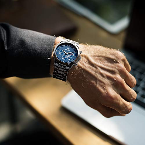 ELEGANTES DESIGN: BY BENYAR bietet eine breite Palette an stilvollen Luxusarmbanduhren, die speziell für Männer gefertigt wurden. Die Uhr kommt mit 100% starkem Glas, blau Zifferblatt und Timer. Das echte Edelstahlband mit einer Breite von 2,2 cm und einer Länge von 22 cm verleiht der Uhr einen edlen Look. Es handelt sich um einen Multifunktions-Chronographen mit drei Hilfszifferblättern für Sekunde, Minute und Stunde.. PREMIUM QUALITY: Die Analoguhr mit Quarzwerk bietet einen edlen Look. Das Gehäuse besteht aus hochwertigem Edelstahl. Das Zifferblatt verfügt über eine integrierte Datumskalenderfunktion, die das Datum anzeigt. Der Gurt ist weich und angenehm zu tragen.. WASSER- UND KRATZFEST: Die Uhr ist wasserdicht bis zu einer Höhe von 30 m und kann Schweiß, versehentlichen Regen oder Spritzwasser aushalten. Diese Uhr ist kratzfest und fühlt sich geschmeidig an. Das haltbare Edelstahlband ist flexibel und hält Ihr Handgelenk belüftet.. EIN PERFEKTES GESCHENK: Diese vielseitige Uhr passt zu jedem Anlass, ob formell oder lässig. Tragen Sie diese Uhr für unterwegs, von Geschäft, Freizeit, Indoor- und Outdoor-Aktivitäten oder für den täglichen Gebrauch. Die Benyar Armbanduhr ist ein perfektes Geschenk für Sie und Ihre Lieben.. 100% ZUFRIEDENHEITSGARANTIE: Ihr Komfort ist unsere oberste Priorität und wir verpflichten uns, unseren Kunden 100% ige Zufriedenheit zu gewährleisten. Wir bieten nur Originalprodukte an und beantworten alle Anfragen innerhalb von 24 Stunden. Ich weiß, dass Ihnen unsere Uhr gefallen wird.. Falls Sie mit unserem Produkt immer noch nicht zufrieden sind, erhalten Sie eine volle Rückerstattung oder einen 100% igen Ersatz. Keine Fragen gefragt. Sie haben nichts zu verlieren, also JETZT BESTELLEN.