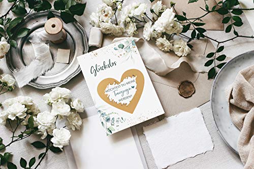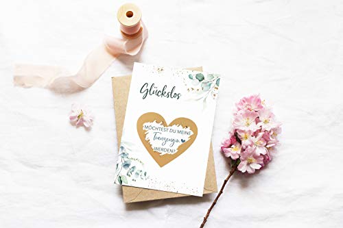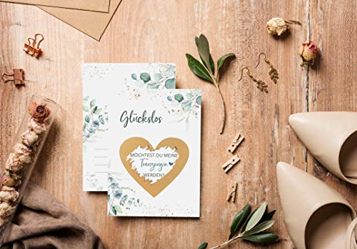 Deine ganz besondere Überraschung, um zu fragen "Willst du meine Trauzeugin sein?. Liebevoll kleben wir über die geheime Botschaft das goldene Rubbelherz auf und du kannst dich ganz auf den Moment der Übergabe freuen.. Mit unseren Glückslosen im Eukalyptus Design hast du einen unvergesslichen Überraschungsmoment, sowie ein super tolles Andenken an diesen Moment.. Top Qualität - Aus hochwertigem 350g Premium-Papier, mit viel Liebe selbst produziert, um den höchsten Ansprüchen gerecht zu werden.. Weil wir bei Jolicoon zu 100% in unsere Qualität vertrauen, geben wir das Versprechen: Solltest du unzufrieden sein, erhältst du dein Geld zurück!
