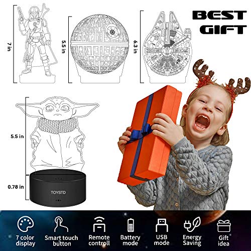 ?7 Farben und 4 Muster?Sie können je nach Stimmung oder Umgebung unterschiedliche Muster und Farben wählen.. ?Sensitive Fernbedienung? Steuern Sie das Nachtlicht mit der Fernbedienung oder der Taste an der Basis.. ?Energieeinsparung? Stromverbrauch: 0,012 kWh / 24 Stunden, LED-Lebensdauer: 10000 Stunden. ?Einzigartiges Geschenk? für Männer Frauen Jungen Jungen Mädchen und alle Star Wars-Fans. Auch ein tolles Thanksgiving-Geschenk, Weihnachtsgeschenk, viele Festivalgeschenke. Dekorlampe für Ihr Schlafzimmer oder Arbeitszimmer usw.. ?3D-Vision-Effekt? Magische 3D-LED-Lampen spielen Ihren Augen einen Streich. Tatsächlich handelt es sich um eine Lichtleiterglasplatte. Sieht besonders aus wie ein echtes 3D-Nachtlicht im Dunkeln oder macht ein Foto!