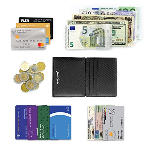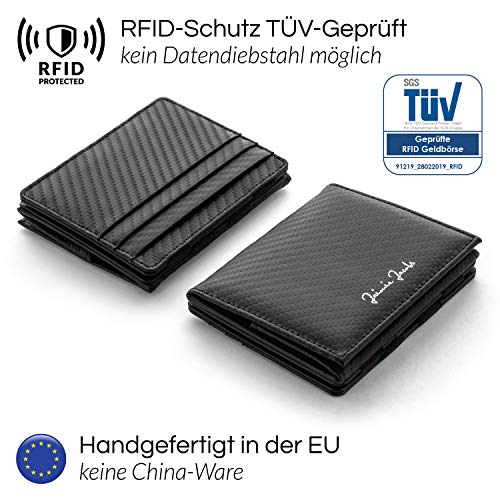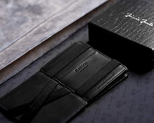 MAGIC TRICK: Unser Magic Wallet ist mit der innovativen Magic-Flap-Funktion ausgestattet. Sie legen Ihre Geldscheine einfach lose auf eine der Innenseiten in den Geldbeutel und schließen ihn. Beim Wiederöffnen der magischen Geldbörse sind die Geldscheine wie von Zauberhand sicher hinter den Gummibändern verstaut.. HANDGEMACHT IN EUROPA: Unser edles Herren-Portemonnaie präsentiert sich in elegantem italienischem Glattleder. Unsere Leder werden pflanzlich gegerbt. Bei der pflanzlichen Gerbung werden natürlich Pflanzenstoffe als Gerbmittel und keine Chemikalien wie Chrome verwendet. Da alle unsere Produkte in Europa in hochwertiger Handarbeit gefertigt werden, wissen wir um die Qualität unserer Geldbörsen und geben daher 3 Jahre Garantie.. RFID-SCHUTZ: Die Schutz-Technologie ist in der Vorder- und Rückseite des Geldbeutels eingearbeitet und schützt alle Ihre Karten vor Datendiebstahl. Mittels RFID können Daten neuerer Reisepässe, Personalausweise oder auch Kreditkarten kontaktlos ausgelesen werden. Unser RFID-Schutz ist TÜV geprüft und schützt Ihre Karten vor unbemerktem Auslesen.. WIENER SCHACHTEL: Der Flap Boy verfügt über ein Münzfach im raffiniertem Stil der Wiener Schachtel. Dieses Kleingeldfach fasst locker 20 Münzen und lässt dabei den Geldbeutel trotzdem noch relativ schlank aussehen. Das magische Portmonee wird in einer eleganten Geschenkbox geliefert und ist somit ein ideales Geschenk zu vielen Anlässen (Geburtstag, Ostern, Weihnachten, Vatertag, Valentinstag). DETAILS: Der Herren-Geldbeutel ist mit 3 Kreditkartenfächern außen und 2 Weiteren innen ausgestattet und bietet somit Platz für 5 bis maximal 10 Karten. Dank der übersichtlichen Fächeraufteilung bewahren Sie stets den Überblick über all Ihre Karten. Produktmaß beträgt: 8cm x 1,5cm x 10cm.