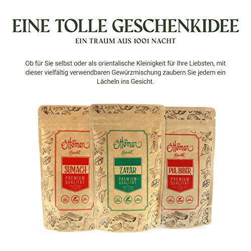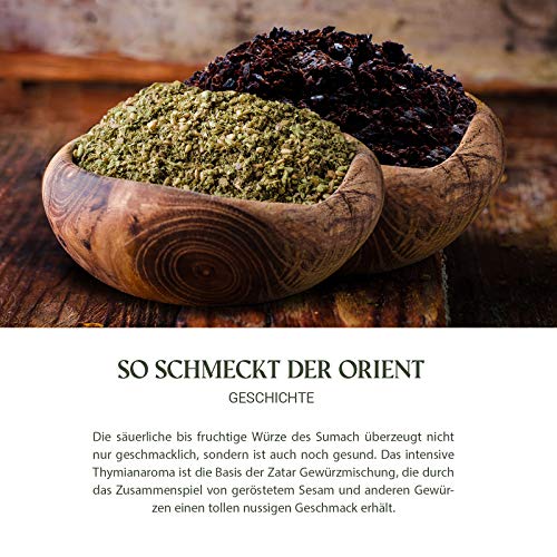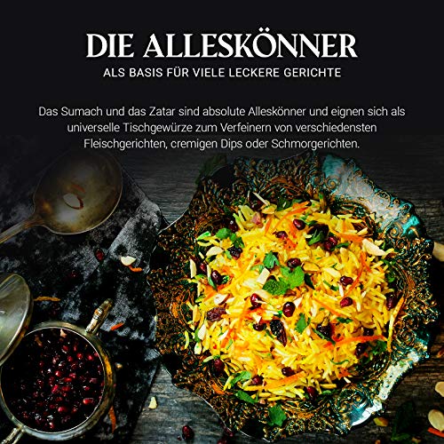 TYPISCH ORIENTALISCH: Lassen sie sich von diesen traditionellen Gewürzmischungen aus säuerlich-fruchtigem Essigbaumgewürz und dem nussig-milden Zatar in einen Traum aus 1001 Nacht entführen.. VIELSEITIG: Das Sumach und das Zatar sind absolute Alleskönner und eignet sich als universelles Tischgewürz zum Verfeinern von verschiedenste Fleischgerichten, cremigen Dips oder Schmorgerichten.. NATÜRLICH REIN: Unsere Gewürzmischungen zeichnen sich dadurch aus, dass die Gewürze handverlesen, 100% natürlich und von der Sonne getrocknet sind sowie ohne Farbstoffe oder sonstige Chemikalien auskommen.. REZEPTIDEE: Bringen Sie Abwechslung auf Ihren Speiseplan! Auf der Rückseite der Gewürze steht jeweils ein Rezept, was besonders gut zu den Gewürzen passt. Lassen Sie sich auch von unserem E-Book inspirieren!. GESCHENKIDEE: Ob für Sie selbst oder als orientalische Kleinigkeit für Ihre Liebsten, mit diesen vielfältig verwendbaren Gewürzmischungen zaubern Sie jedem ein Lächeln ins Gesicht.
