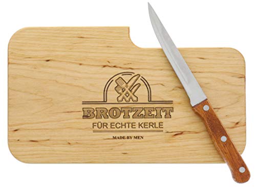 IDEALES GESCHENK – Egal ob als wunderschönes Geschenk zum Geburtstag, Weihnachtsgeschenk oder einfach als kleine Aufmerksamkeit für Zwischendurch. Der Beschenkte wird sich an jedem Tag, an dem er das Schneidbrett benutzt, erneut darüber freuen.. HOCHWERTIGE GRAVUR – Das Brett verfügt über eine äußerst hochwertige und punktgenaue Lasergravur (Made in Germany) und macht das Brett zum absoluten Hingucker. Die Gravur ist beständig und dauerhaft angebracht und kann nicht abgewaschen werden.. ROBUSTES ERLENHOLZ – Aufgrund seiner einzigartig feinen und massiven Struktur wurde das Brett bewusst aus Erlenholz gefertigt und mit einem lebensmittelechten Spezialöl behandelt.. PFLEGEHINWEISE – Durch die feinen Konturen der Lasergravur empfehlen wir das Brett nur per Hand zu waschen und nicht lange einzuweichen.. DETAILS – Schneidebrett aus Erlenholz | Größe: 26 x 15 x 1,2 cm | Gravurmotiv: Brotzeit für echte Kerle | Lieferumfang: Brotzeitbrett mit Lasergravur inkl. Messer.