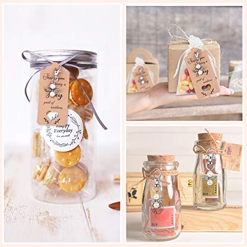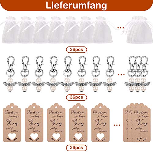 ????SET: In diesem Set erhält man alles, um Gastgeschenke für Hochzeit/Taufe oder einen anderen besonderen Anlass schön zu verpacken: Es finden sich je 36 Engelchen-Anhänger mit Perlen, Pappschilder und Organza-Säckchen.. ????SPEZIELLE DEKORATION FÜR HOCHZEITSFESTE: “Die Organza-Säckchen sind in Qualität und Verarbeitung in Ordnung und erwartungsgemäß. Der Engel-Anhänger hat mich sehr positiv überrascht! Die Qualität ist wirklich gut, sie sind stabil und sehen süß aus! ”Unser Kundenfeedback.. ????ERINNERBARES GESCHENK: ""Ich finde, die Engel kann man auch super als Mitbringsel benutzen - nicht nur für Hochzeiten."" Diese engelförmigen Ornamente sind eigentlich nicht nur praktischer Schlüsselanhänger, sondern auch besondere Souvenirs. Zusätzlich zu der kleinen Kordeltasche können Ihre Gäste Süßigkeiten und Pralinen für die Hochzeit mitbringen, die sie in diesem Moment glücklich machen werden.. ????EXQUISITE MAKING VINTAGE STYLE: Kraftpapieretikett, weißer Engelsschlüsselbund, Süßigkeitensäcke mit Kordelzug - nichts lässt eine romantische Atmosphäre erkennen. Der umweltfreundliche Engelsschlüsselring aus Kupferlegierung ist nicht leicht zu rosten. Antikes Silber-Effekt-Design, schwarzer Lack erscheint in einigen Details, was ein normales Phänomen bei der Gestaltung des Prozesses ist.. ????DAS BESTE DANKESCHÖN: ""Thank you for being a key part of our lives"" Alles Top, sind alle ganz und auch beutel und danke Fähnchen sind für alle dabei.