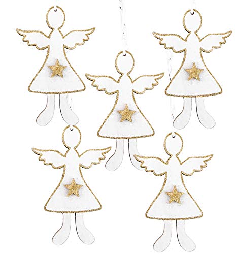 5 dezente Engelfiguren Anhänger in weiß mit goldfarben glitzernder Umrahmung und einem goldenen Stern in der Mitte. Die Engelanhänger sind ohne Schnur gemessen ca. 12 cm groß.. Dank der Schnur lassen sich die Anhänger überall leicht befestigen, egal ob als Holzdeko am Weihnachtsbaum oder als Geschenkanhänger an Weihnachtsgeschenken.. Die Holzengelchen werden gerne als Christbaumschmuck verwendet, oft werden sie aber auch als kleines Geschenk, Gastgeschenk, Give-Away oder Mitgebsel zu Weihnachten an Familienmitglieder, Freunde, Kinde, Kollegen, Mitarbeiter oder auch an Kunden verschenkt. Über eine kleine Aufmerksamkeit zu Weihnachten freut sich schließlich jeder. ????. In unserem Amazon-Shop findet ihr noch viele weitere weihnachtliche Deko-Artikel, Geschenkideen zu Weihnachten und vielen anderen Anlässen, Gastgeschenke, Geschenkverpackungen sowie Aufkleber und Tischkarten. Schaut doch mal vorbei ??. Mit LIEBE und HERZ vom kleinen und blitzschnellen Logbuch-Verlag aus Bayern.