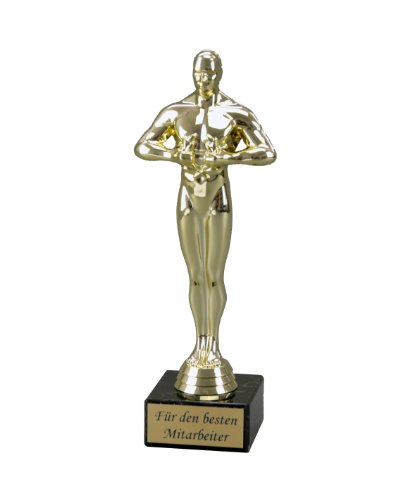 Höhe ca 24 cm inkl. Sockel. Figur aus glänzendem, goldfarbenem Kunststoff. Sockel aus Marmor in schwarz. Lasergraviertes goldenes Gravurschild bereits angebracht. ca 600 g schwer