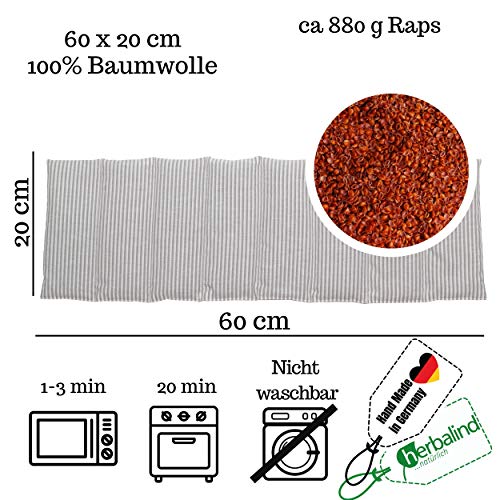 ???? 8-KAMMER PREMIUM KISSEN - Mit unserem 8-Kammer Rapssamen Kissen erhalten Sie ein hochwertiges Körner Kissen Die natürlichen Rapssamen besitzen wegen ihres hohen Ölanteils eine hervorragende Wärme- und Kälte Speicherfähigkeit. Rapssamen sind sehr klein und fast kugelrund, daher ist ein Rapssamenkissen sehr anschmiegsam und haben eine sanfte Massagewirkung.. ???? WÄRME AUS DER NATUR - natürlich und hochwertig - Das Kissen ist aus natürlichen Materialien verarbeitet. Die Rapssamenfüllung ist hochwertig und gereinigt. Nach 3-4 Minuten Erwärmung in der Mikrowelle genießen Sie zwischen 15-30 Minuten natürliche Wärme. Das Kissen kann ebenso in ein Gefrierfach gelegt werden und zur großflächigen Kühlung verschiedenster Körperteile verwenden werden.. ???? WOHLTUEND UND ENTSPANNEND - Alles für Ihre Gesundheit -die angenehme Wirkung der Rapssamen in Kissen ist seit langem bekannt. Das Naturprodukt Raps wurde bereits seit vielen Jahrhunderten, zu therapeutischen Zwecken verwendet, ist aber in den letzten Jahrzehnten in Vergessenheit geraten. Wärme und Kälte werden aufgrund der tollen Eigenschaften des Rapssamens dosiert und gezielt abgegeben.. ???? WOHLIGE WÄRME - Jeder kennt es, manchmal braucht der Körper besondere Zuwendung! Das Rapssamenkissen kann erwärmt zum Wohlbefinden beitragen. Machen Sie es sich gemütlich und entspannen Sie bei natürlicher Wärme. Sie können ihr Rapssamenkissen natürlich auch zum Kühlen verwenden, als Alternative zum Kühlpad aus Kunststoff.. ? MADE IN GERMANY - Unsere Rapssamenkissen werden in unserem Integrationsunternehmen in Handarbeit gefertigt und konfektioniert! Natürliche Füllstoffe sind kennzeichnend für unsere hochwertigen Produkte. Wir arbeiten nachhaltig und sinnvoll. HERBALIND wurde 2002 gegründet, setzt auf den Wirtschaftsstandort Deutschland und beschäftigt über 40% Mitarbeiter mit Einschränkungen.