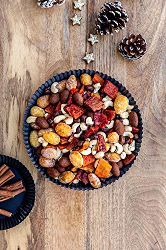 TOLLE GESCHENKIDEE: als Weihnachtsgruß für entfernte Freunde, Weihnachtspräsent für die Kollegin, Nachbarin, Freundin oder Mitbringsel für die Einladung zum Adventsbrunch oder -Kaffee. INHALT: Bio Cashewkerne, Bio-Weinbeeren in Bio-Zartbitterschokolade, Zimtmandeln mit Schokolade, kandierte Zwergorangen und fröhlich leuchtende Papayas. MIT LIEBE SCHENKEN UND GENIESSEN: Ob als Weihnachtsgeschenk oder für Dich selbst als süßer Snack zum Kaffee, Tee, Spieleabend usw. – die leckere Mischung Fröhliche Weihnacht passt perfekt. QUALITÄT AUS MÜNSTER: Als kleines Familienunternehmen steht Jalall D’or für hochwertige Zutaten. Vertraue auf unsere langjährige Erfahrung und überzeuge Dich selbst.. VIELFÄLTIG: Entdecke weitere Mischungen von Jalall D’or mit Nüssen, Trockenfrüchten und schokoladigen Snacks für Dich oder zum Verschenken, hergestellt in unserer kleinen Manufaktur in Münster.