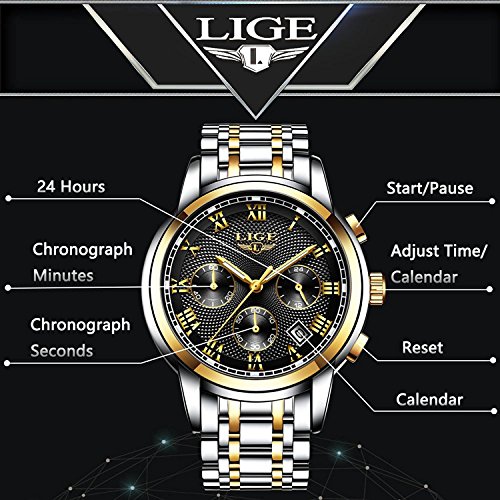 LIGE Herren Uhren Edelstahl Sport Wasserdicht Analoger Quarz Uhr Lässig Chronograph Kalender Schwarz Armbanduhr Maenner