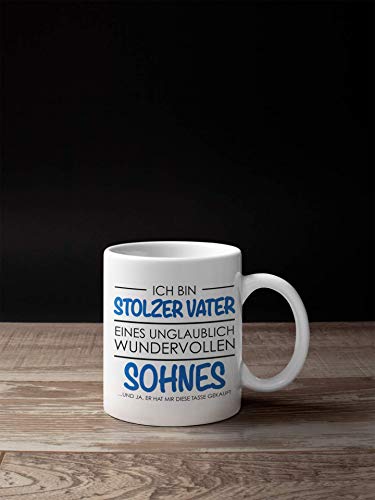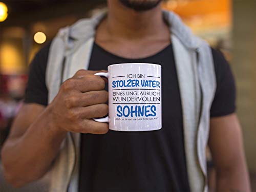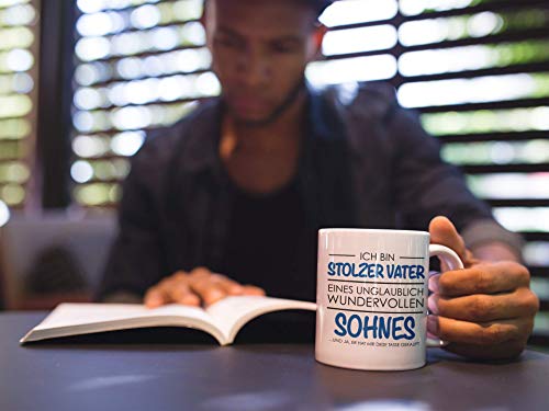DESIGN - Die Tasse für alle Papas, die super stolz auf ihre wundervollen Söhne sind. Die lustig bedruckte Tasse mit Spruch sorgt sicher für einen Schmunzler. Eine tolle Geschenkidee zum Vatertag.. ANGEBOT - Die Tasse ist beidseitig bedruckt, der große Henkel sorgt für einen optimalen Griff. Eine super Geschenkidee Tasse für den Super Papa als Vatertagsgeschenk.. ANLASS - Hier kommt das ideale Geschenk für Männer. Ob zum Vatertag, als Geschenk an Weihnachten für Papa oder zum Geburtstag, diese lustig bedruckte Tasse ist ein tolles Vatertagsgeschenk Baby.. QUALITÄT - Wir bieten hochwertige Qualität. Die Tasse ist alltagstauglich, spülmaschinenfest, mikrowellenfest und verspricht eine lange Farbbrillanz. Die Lieferung erfolgt in einem stabilen Karton.. GRÖSSE – Die Kaffeetasse misst 9,5 cm, hat 8 cm Durchmesser, und hat ein Fassungsvermögen von etwa 325ml (11oz). Gute Geschenkideen Vatertag zu finden ist oft schwer, diese Tasse mit Spruch macht es dir leicht!