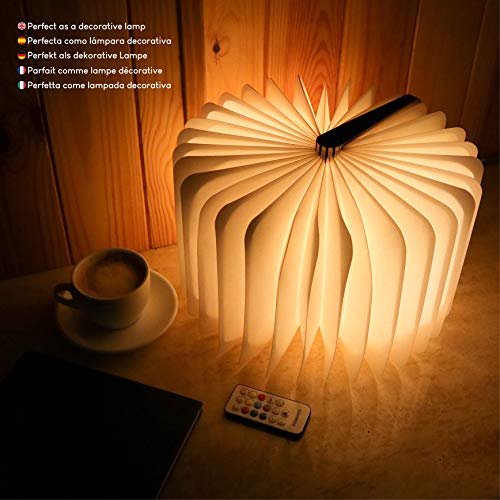 ???? FERNBEDIENUNG INKLUSIVE ???? Ändern Sie die Farbe mit der Fernbedienung und wählen Sie aus bis zu 12 Farben dieser Buch Licht. Die Intensität des Lichts kann geändert und 2 verschiedene Programme verwendet werden. Außerdem können Sie die Farbe ändern, indem Sie das Lampe Buch öffnen und schließen! Ideal für Dekoration Wohnung Modern und Büro. ???? TIMER FUNKTION ???? Stellen Sie den Timer auf 30 Min, 1 Stunde oder 2 Stunde ein, so dass die dekorative Lampe automatisch ausschaltet, ohne dass Sie etwas tun müssen. Wiederaufladbare Lampe von 500 Lumen mit USB-Anschluss, aus Nussbaumholz und widerstandsfähigem Pergamentpapier. Perfektes Umgebungslicht für den Einsatz als Schreibtischlampe und Nachttischlampe. ???? AKKUT HÄLT MEHR ALS 8 STUNDEN ???? Buch Schreibtischlampe mit 2.500 mAh Akku, der mehr als 8 Stunden hält. Die LED Buch Lampe ist größer als andere und kann während des Ladevorgangs verwendet werden. Originales Geschenk zum Geburtstag, Weihnachten & Jubiläum Geschenke für sie und ihn. ???? PERFEKT ALS GESCHENK ???? Überraschen Sie jeden mit diesem farbverändernden Buchlampen, originelles Geschenk für Freunde, Papa, Mama, Großvater, Großmutter , Freundin oder Freund. Diese Lampe hat einen Magnetverschluss und kann verschiedene Positionen einnehmen. Tolle LED Buchlampe für LED Home Deko. ???? 1 JAHR ZUFRIEDENHEITSGARANTIERT ???? Sind Sie mit Ihrem Farbwechsel Nachtlicht nicht 100%ig zufrieden? Keine Sorge, starten Sie einfach den Retouren-Vorgang. Wir geben Ihnen Ihr Geld zurück, ohne Fragen zu stellen. Ihre Zufriedenheit ist das Einzige, was zählt!