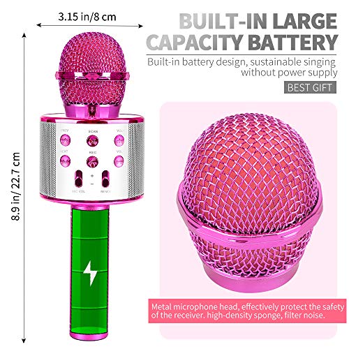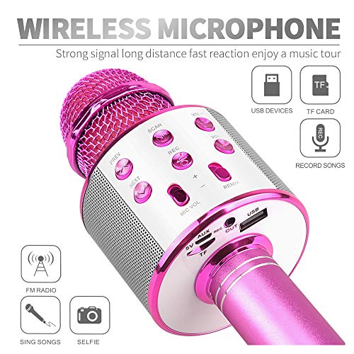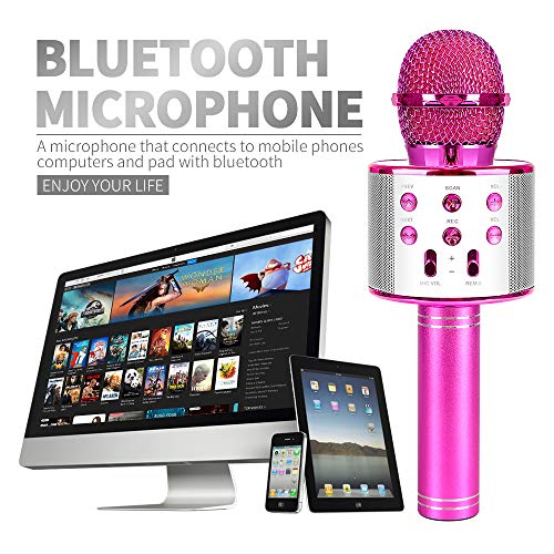 ? Hohe Klangqualität: Das perfekte Bluetooth-Mikrofon verfügt über einen eingebauten Lithium-Akku mit großer Kapazität und eine lange Akkulaufzeit. Befreien Sie sich von Plug-Ins, Sie können jederzeit und überall singen. Das Mikrofon verfügt über zwei integrierte hochwertige Stereolautsprecher, darunter einen intelligenten Rauschunterdrückungschip und drei Schichten von Filtern mit hoher Dichte, mit denen der Klang verschönert und Rauschen intelligent reduziert werden kann.. ? Exquisites Aussehen: Das Bluetooth-Karaoke-Mikrofon besteht aus einer Aluminium-Magnesium-Legierung und hat ein modisches Aussehen. Das tragbare tragbare Bluetooth K-Songmikrofon mit exakter Mattstruktur, das integrierte HiFi-Audiosystem in Kombination mit der Rauschunterdrückungstechnologie, der erstaunliche KTV-Live-Sound, der klare Musikrhythmus und der Echohall können Ihnen dabei helfen, den Klang von besser zu finden.. ? Zweiwege-Verbindung: Das Bluetooth-Mikrofon kann über Bluetooth oder kabelgebundenes USB angeschlossen werden. Dies ist bequem und praktisch und leicht zu transportieren. Es unterstützt Android, iPhone, iPad, iOS und alle Smartphones und die Bluetooth-Verbindung kann bis zu 10 Meter lang sein. Schließen Sie das Mikrofon einfach an ein Bluetooth-Gerät an oder verwenden Sie eine kabelgebundene USB-Verbindung, um Ihre Gesangsanwendung auf Ihrem Telefon, Computer oder Tablet zu öffnen.. ? Professionelles Design: Das drahtlose Bluetooth-Karaoke-Mikrofon verfügt über einen professionellen Mixer, mit dem der Wiedergabemodus problemlos geändert werden kann. Sie können frei zwischen dem vorherigen und dem nächsten Song-Modus wechseln. Atemberaubender KTV-Live-Sound, klarer Musikrhythmus und Echo-Nachhall. Dank des fortschrittlichen Mikrofons mit zwei Stereolautsprechern können Sie Ihr Smartphone über Bluetooth und USB-Kabel verbinden und jederzeit und überall hören und singen.. ? Das beste Geschenk für Kinder: Dieses drahtlose Bluetooth-Mikrofon kann als Weihnachtsgeschenk, Geburtstagsgeschenk, Neujahrsgeschenk, Halloween-Geschenk, Familiengeschenk, Weihnachtsgeschenk usw. für Jungen und Mädchen im Alter von 3 bis 6 Jahren verwendet werden. Sie eignen sich sehr gut für KTV-Partys, Geburtstagsfeiern und Familienfeiern. Sie eignen sich für Kinder und Kinder im Alter von 4 bis 15 Jahren, um Musik und Geschenke zu teilen, und sie sind auch sehr gut für Erwachsene geeignet.
