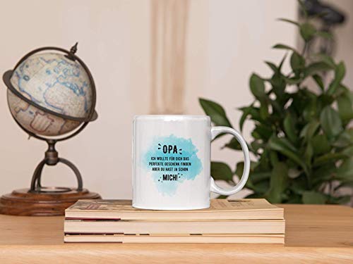 DESIGN: Geschenke für Opa zu finden ist nicht so einfach. Er hat ja immer schon alles. Diese Tasse aber bestimmt noch nicht! Dein Opa verdient schließlich das perfekte Geschenk. Damit kannst du ihn überraschen und eine große Freude machen.. ANGEBOT: Die Tasse wurde bedruckt mit dem lustigen Spruch „OPA ich wollte für dich das perfekte Geschenk finden, aber du hast ja schon MICH!“. Das perfekte Opa Enkel-in Geschenk, Weihnachtsgeschenk oder Geburtstagsgeschenk für einen Opa, der Humor hat.. ANLASS: Das perfekte Opa Enkel-in Geschenk. Durch die vielen Optionen eignet es sich auch hervorragend als Geschenk zusammen mit der Schwester oder dem Bruder. Egal ob zum Geburtstag, zu Weihnachten oder als Vatertagsgeschenk, die Überraschung gelingt. Eine super Geschenkidee für Opa!. QUALITÄT: Unsere Tassen sind spülmaschinenfest, mikrowellenfest und versprechen lange Farbbrillianz. Das Fest der Liebe, nämlich Weihnachten steht vor der Tür. Hole dir mit dieser Tasse das perfekte Geschenk für deinen Opa und überrasche ihn damit.. GRÖSSE – Die Kaffeetasse misst 9,5 cm, hat 8 cm Durchmesser, und ein Fassungsvermögen von ca 325ml (11oz). Sie wird mit Liebe in Deutschland bedruckt und wird in einem stabilen Karton geliefert.