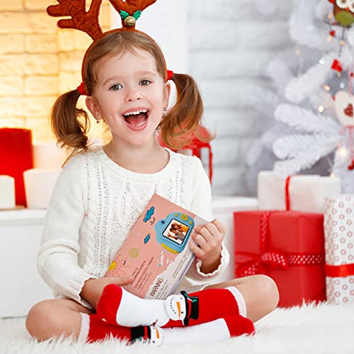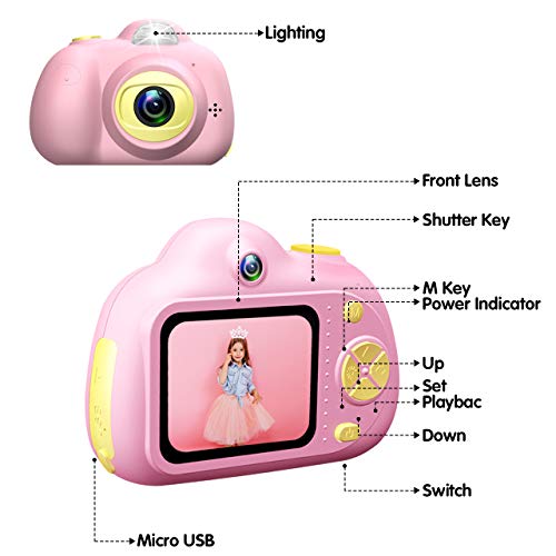 ?8,0 Megapixel & 1080p HD-Video?Die Kinder-Digitalkamera hat zwei Kameras, die Vorder- und Rückseite sind beide 8,0 Megapixel, 4-fach Digitalzoom, 2-Zoll-LCD-Display-Bildschirm, deutlich verbessert die Definition der Fotos im Vergleich zu anderen Kinderkameras auf dem Markt. Die Kindervideokamera kann bis zu 1920x1080P Video aufnehmen, wird den klaren wunderbaren Moment für Kinder behalten.. ?Sicheres und stoßfestes Material? Diese Mini-Digitalkamera mit umweltfreundlichen, ungiftigen Materialien hat eine perfekte Größe für kleine Hände. Halten Sie diese Kamera einfach und fest in den Händen. Die stoßfeste Schutzhülle bietet einen wirksamen Absturzschutz. Sie ist sehr langlebig und sicher und bietet eine komfortable Möglichkeit, mit der Kinderkamera Fotos oder Videos aufzunehmen. Lassen Sie Ihre Kinder ihre unvergesslichen Momente festhalten.. ?Mehrere Funktionen Kinderkamera?Basierend auf der ursprünglichen Fotoaufnahme verfügt die neue digitale Kinderkamera über weitere Funktionen: Fotoaufnahme, Videoaufnahme, Wiedergabe, Selbstauslöser, Datumseinstellung, Taschenlampe, Unterstützung für lächelndes Gesicht, Ankleben des großen Kopfes , Serienaufnahmen und Timing-Aufnahmen usw. Im Fotomodus stehen 8 Szenen und 30 niedliche Bilderrahmen zur Auswahl. Kinder können ihre Lieblingsszene oder ihren Fotorahmen auswählen.. ?Akku & Stromsparmodus aving?Eingebauter 3,7-V-Lithium-Akku und Ladezeit von 1 bis 2 Stunden können über ein USB-Kabel mit einem Computer oder einem anderen Gerät aufgeladen werden. Wenn Ihre Kinder mit einer Kinderkamera arbeiten, öffnen Sie einfach den Schalter und genießen Sie den Spaß am Fotografieren, der einfach zu bedienen ist. Es können 2-3 Stunden lang Fotos aufgenommen werden. Automatische Abschaltung, wenn kein Betrieb erfolgt, um die Batterielebensdauer zu verlängern.. ?Beste Geschenke für Kinder?Kann als Geburtstagsgeschenk, Belohnung, Weihnachtsgeschenk oder Spielzeugpreis für Karnevalsspiele verwendet werden. Nur das Gewicht von 95 g und die kompakte Größe sorgen dafür, dass die Kamera überall bequem zu transportieren ist. In der Verpackung befindet sich ein strapazierfähiges Trageband, mit dem Kinder die Minikamera am Hals aufhängen können. Erfassen Sie einfach Szenen oder Tiere in der Natur mit der Familie, erleben Sie den Spaß aus der Natur.
