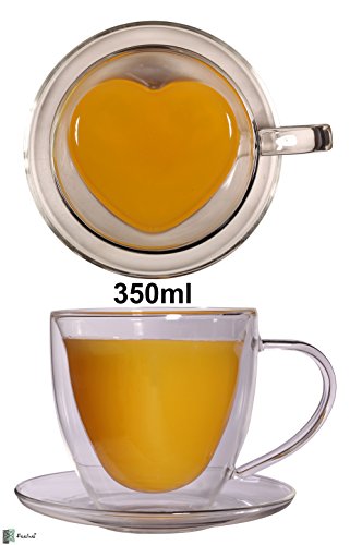 350ml doppelwandige Glas Thermo - Herztasse mit Untersetzer, Teetasse/Kaffeetasse mit Schwebeeffekt, Herz Herzform zum Muttertag, Weihnachten by Feelino