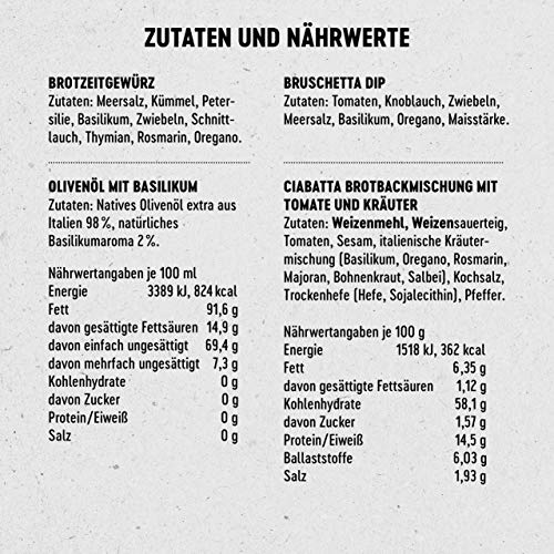 EINFACH BESONDERS – Es muss nicht immer ein Menü sein, manchmal genügen wenige, hochwertige Zutaten für perfekten Genuss: Ofenwarmes Ciabatta, ein raffinierter Dip aus mediterranen Gewürzen … Mit unserer italienischen Brotzeit begeistern Sie Familie & Freunde.. DAS ERWARTET FEINSCHMECKER – Eine Backmischung für mediterranes Ciabatta mit duf-tenden Kräutern & fruchtigen Tomaten, natives Olivenöl mit dem unverwechselbaren Aroma von Basilikum, einen klassischen Bruschetta Dip und unser pikantes Brotzeitgewürz.. FREI VON KÜNSTLICHEN ZUSÄTZEN - Unsere Produkte werden nach eigener Rezeptur herge-stellt und unterliegen Roja Gepps Reinheitsgebot: frei von künstlichen Zusatzstoffen, Geschmacks-verstärkern oder künstlichen Aromen entstehen Spezialitäten, die Feinschmecker begeistern.. ALS GESCHENKSET: Unser Brotzeit Set ist das perfekte Geschenk. Ob für Mann oder Frau, Schwester oder Bruder, Kollegen oder Nachbarn. Ob zum Geburtstag, zu Weihnachten, zum Einzug oder als kleines Dankeschön.. GESCHENKIDEEN VON GEPP’S: Besondere Geschenke für den Mann wie für die Frau sind oft schwer zu finden. Bei Gepp’s finden Sie eine vielseitige und einzigartige Auswahl an Geschenkkörben und Geschenksets für alle Anlässe.