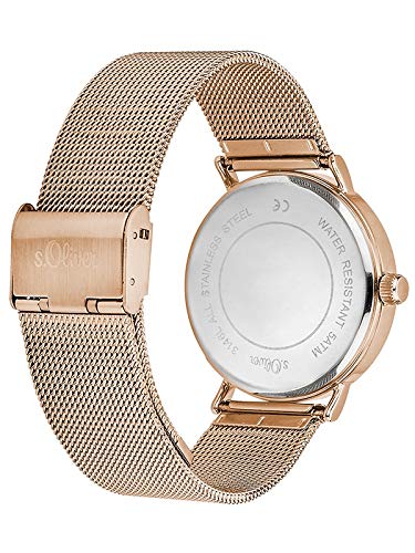 Edelstahlgehäuse IP Roségold, poliert. Milanaiseband aus Edelstahl IP Roségold. kratzunempfindliches Mineralglas. Gehäusegröße: 38 mm, Bandbreite: 20 mm, Wasserdichtigkeit bis 5 ATM. Verpackt in der original s. Oliver Geschenkverpackung