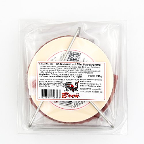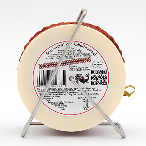 ? Pikanten Wurst Snack Mini Kabeltrommel mit 3,50 m Wurst (Höhe inkl. Gestell ca. 16 cm). ? Absolute Spitzenqualität aus Bayern, ungekühlt und lange haltbar. ? Allergenfrei und in Deutschland hergestellt, Mindesthaltbarkeitsdatum (MHD) ab Versand mindestens 60 Tage. ? Über Buchenholz geräuchert, feste Konsistenz und ohne Haut bzw. Darm, daher problemlos sofort zu genießen. ? Unsere leckere Snackwurst ist der perfekte und witzige Geschenk Geheimtipp 2020 zu Ostern, zum Vater- und Muttertag, Junggesellenabschied, Namenstag, Geburtstagen, zu Weihnachten, zum Valentinstag und lustige Idee für jede Feier!