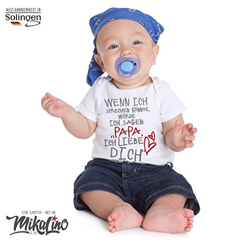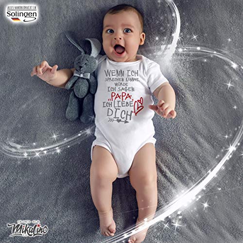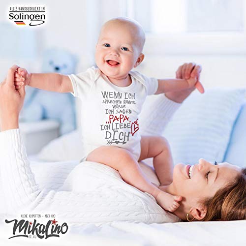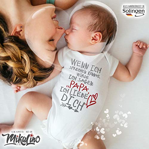 100% MIKALINO Babystrampler kurzarm | Design: Wenn ich sprechen könnte würde ich sagen: Papa ich liebe Dich | Das lässt Papas Herz dahinschmelzen. | handbedruckt in Deutschland (Solingen) | Für Junge oder Mädchen | Unsere Baby und Kinderkleidung wird mit den klassischen und hochwertigen Druckverfahren in Deutschland (Solingen) mit liebevoller Handarbeit bedruckt. Super Waschbeständigkeit (bis 60 Grad) was ja gerade bei Babykleidung wichtig ist.. PERFEKTES GESCHENK: Eine schöne Idee zur Geburt für das kleine Neugeborene, zum Geburtstag, zur Taufe, Valentinstag, Vatertag oder Muttertag, Ostern, ein Kostüm für Fasching, zu Halloween, Weihnachten oder Neujahr. Auch eine lustige Idee für die beste Tante / Patentante, den coolen Onkel / Patenonkel, für meine liebste Mama, besten Papa, die verrückte Oma oder bester Opa, Cousin, Cousine, kleinen Bruder oder große Schwester und noch vieles mehr.. TOLLE PASSFORM: Die Kurzarmstrampler, meist in verschiedenen Farben erhältlich, u.a. in weiß, schwarz, grau, rosa, blau, rot, pink etc. und den Größen. Gr 50 / 56 , 62 , 68 , 74 , 80 , 86 / 92 | Der Kurzarmbody von Mikalino hat eine erstklassige Passform und ist durch sein flauschig weiches Material sehr angenehm zu tragen.. VIELE WEITERE IDEEN: Entdecke viele weitere tolle witzige und niedliche Motive in unserem Amazon-Händlershop, ein KLICK auf unseren MARKENNAMEN ganz oben genügt. 100% QUALITÄT: Mikalino Strampler mit kurzen Ärmeln aus 100% weicher Interlock Bio-Baumwolle, mit OEKO-TEX 100 Standard und faire Handelskette (heathergrey 90% Bio-Baumwolle / 10% Viskose)